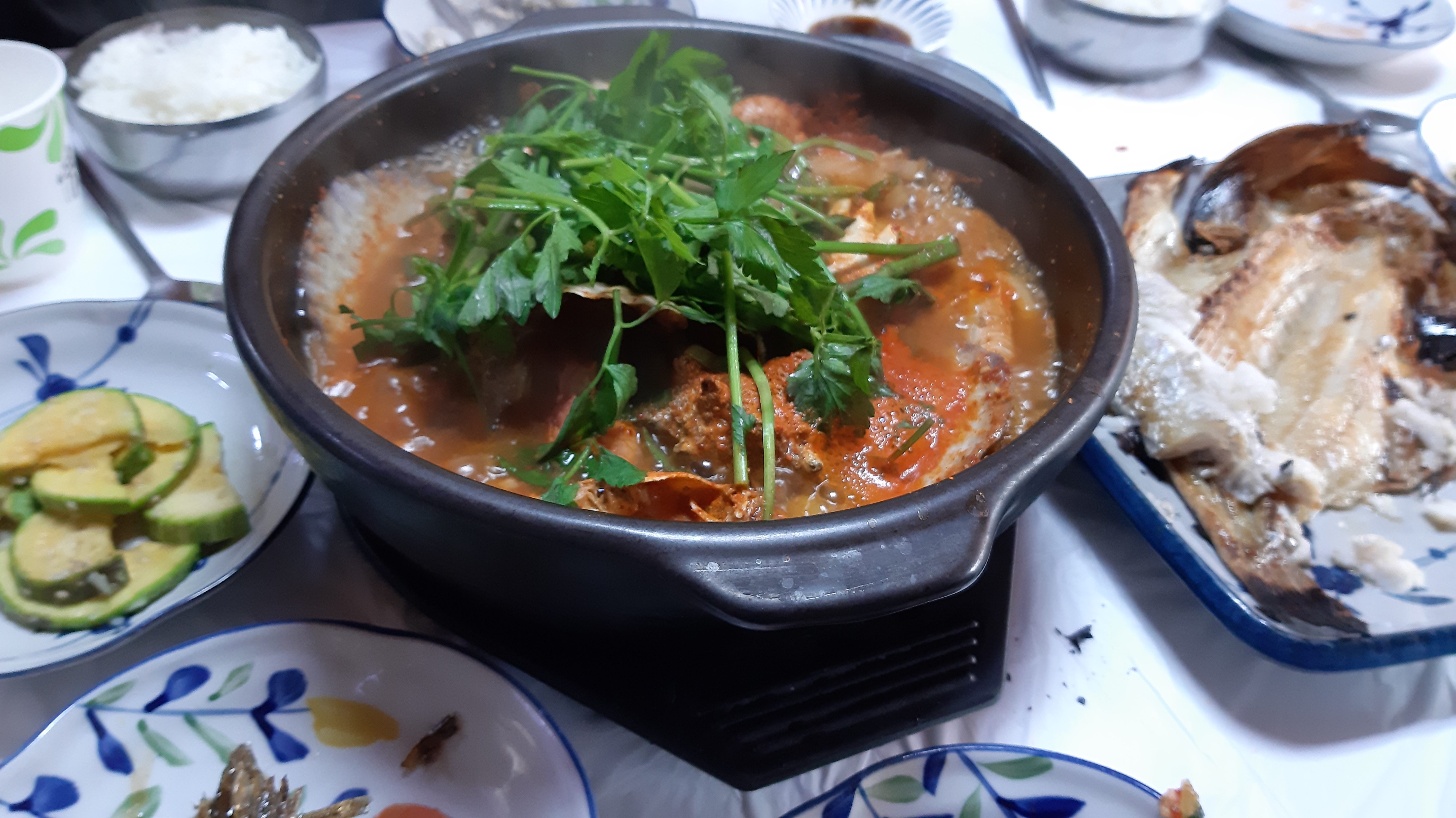 점심으로는 해물뚝배기와 생선구이를 먹었습니다.