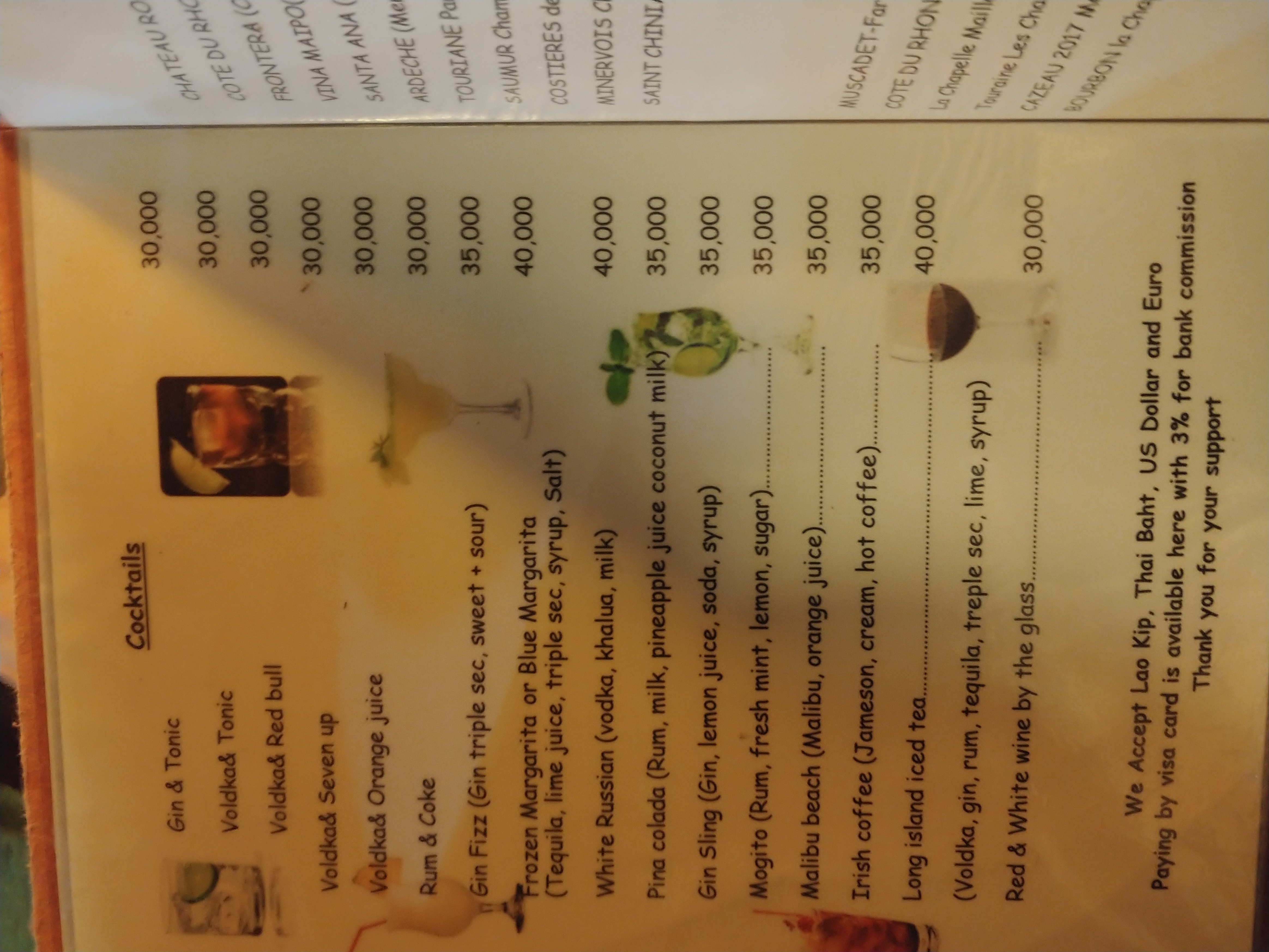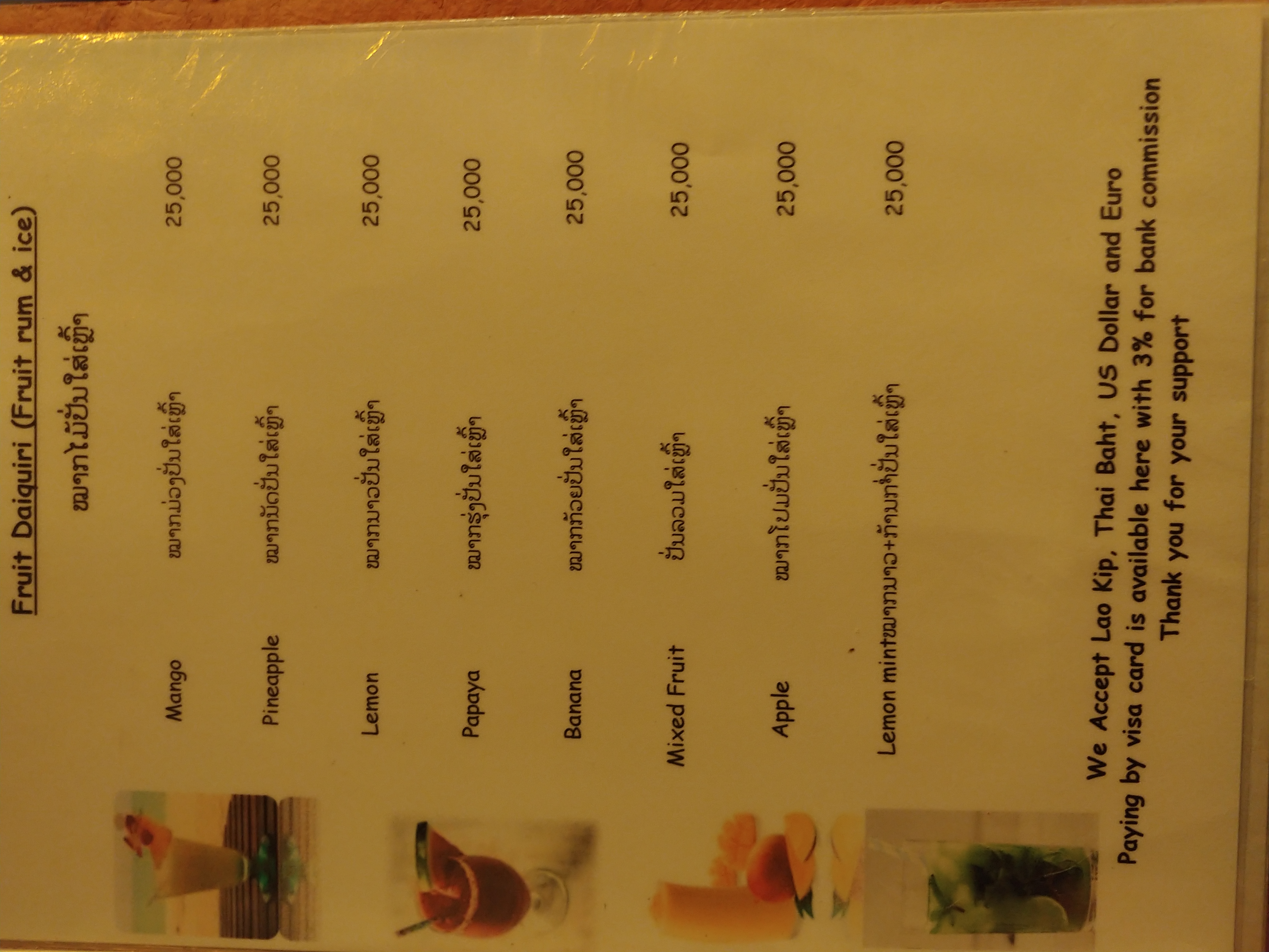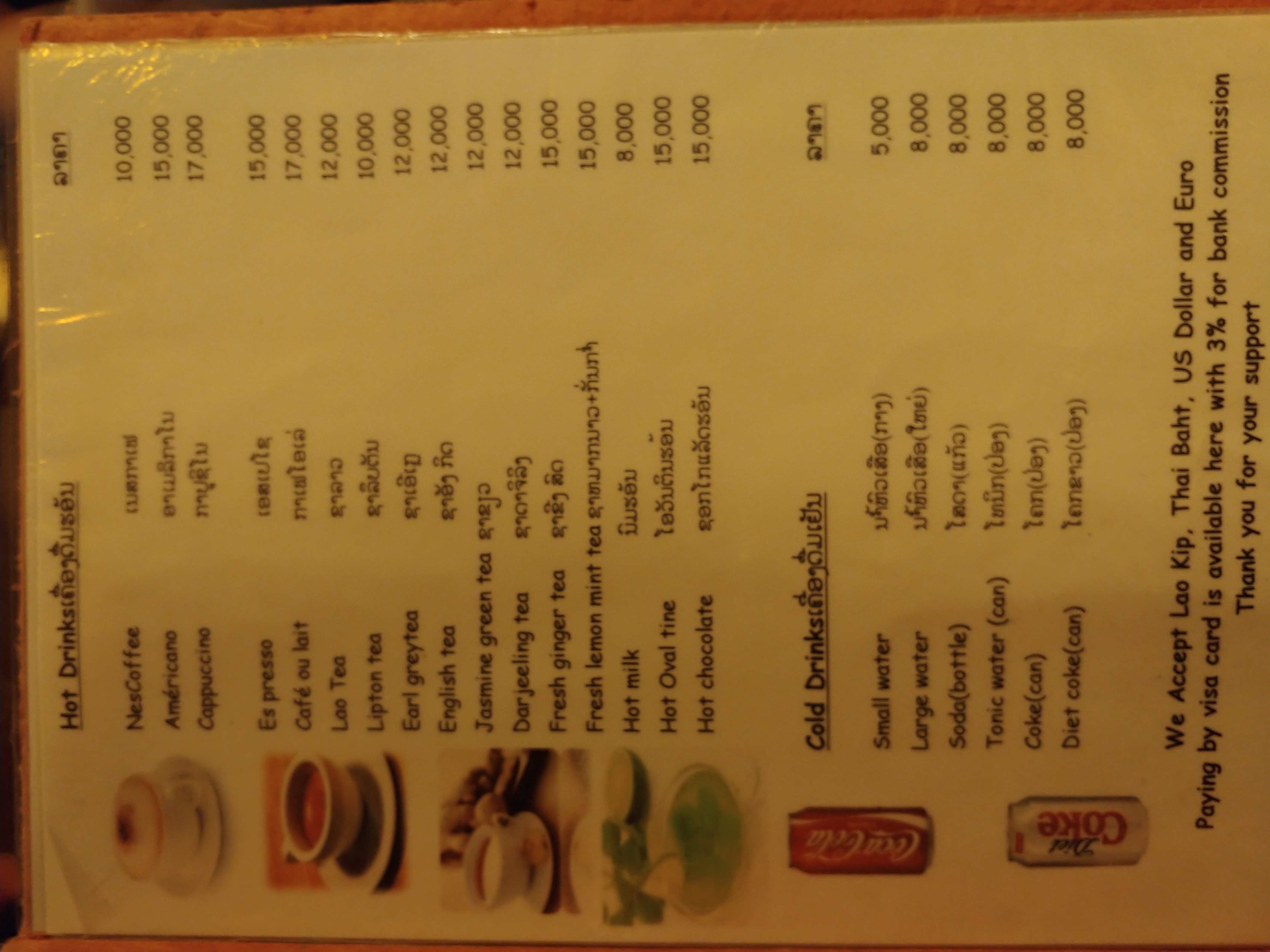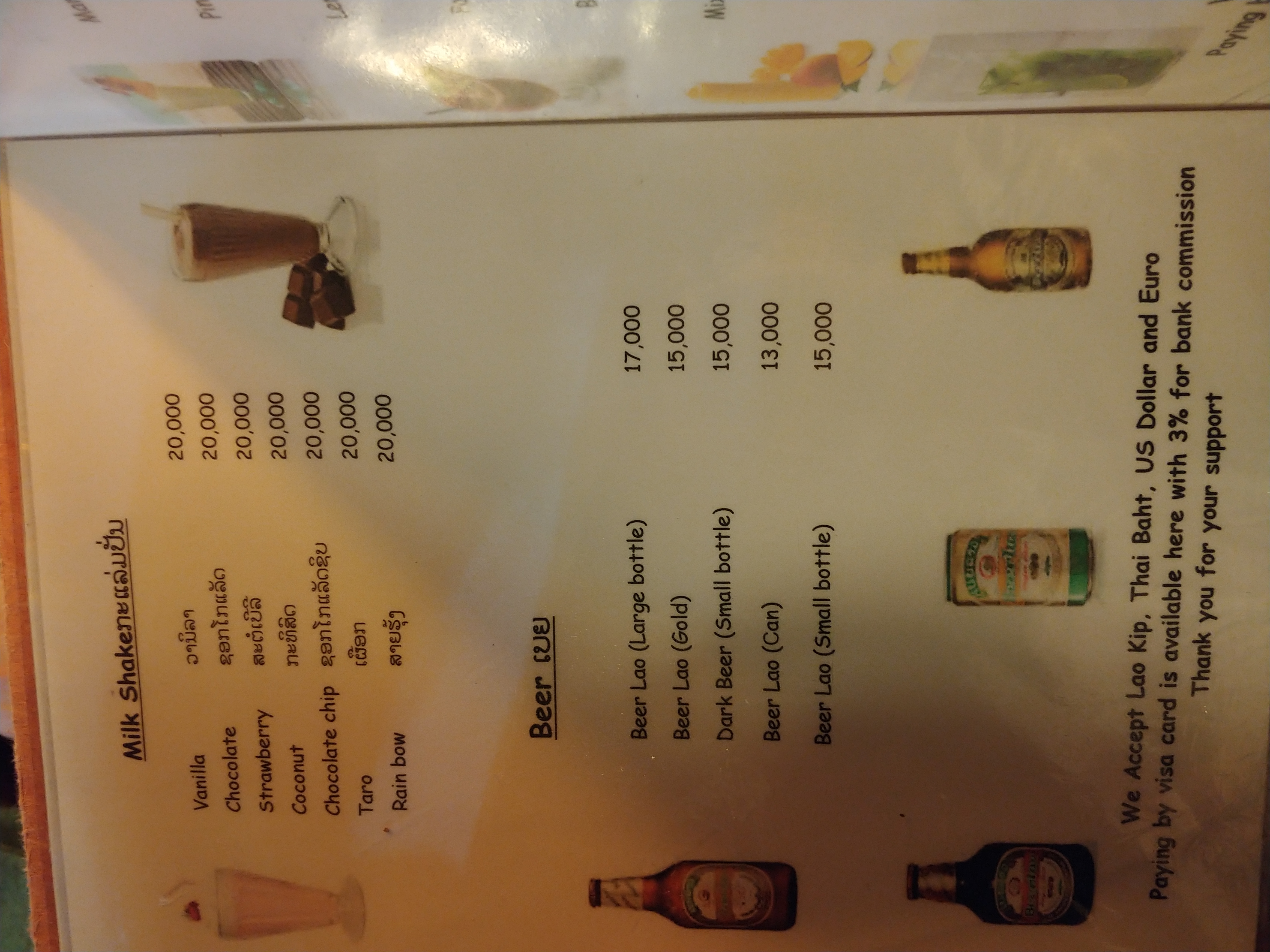 음료는 콜라(coca cola), 사이다(7 up), 맥주(lao beer)가 있었습니다.