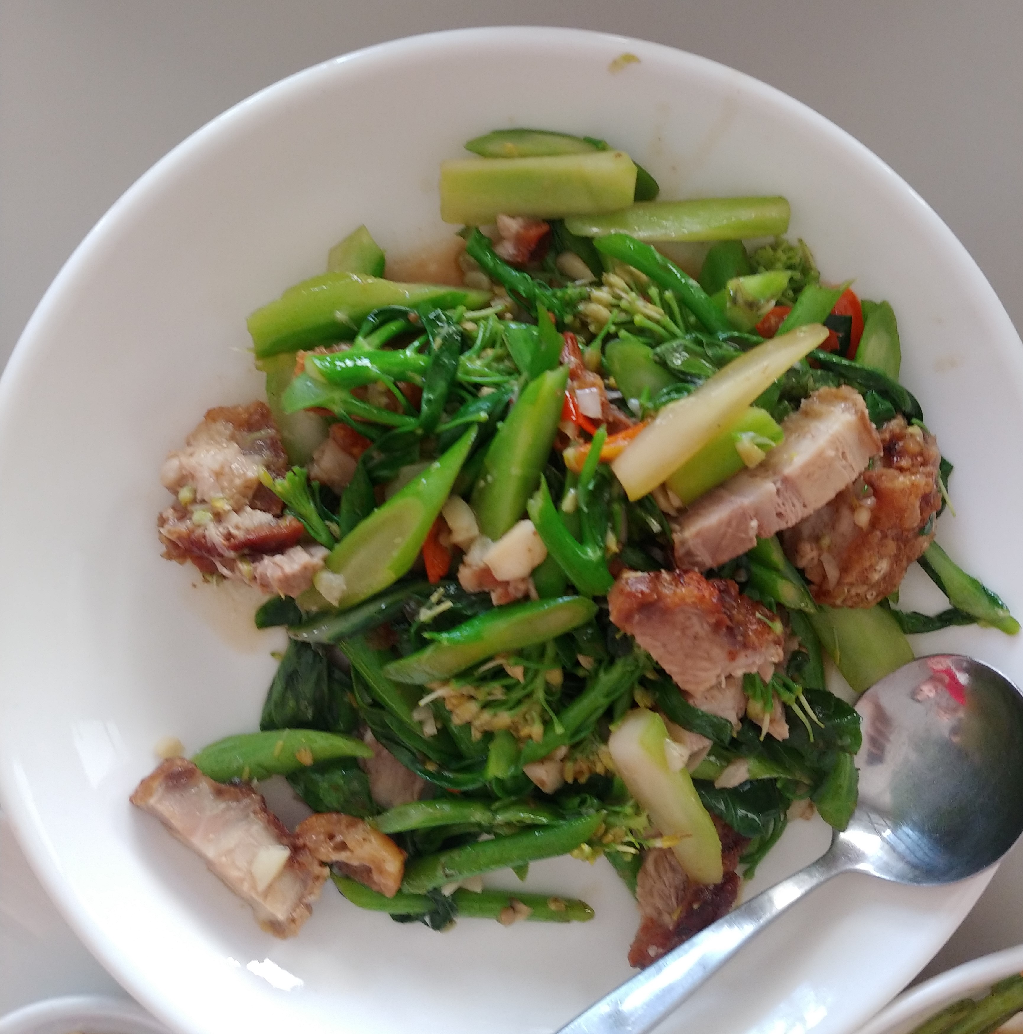 크리스피 삼겹살 무침 ,볶음밥, 모닝글로리입니다.