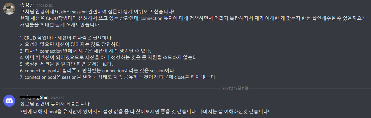 - 아래는 내가 db, session, connection pool에 대해 너무 헷갈려서 이것저것 고민하다 질문했던 내용과 답변이다! 부디 도움되시길.
