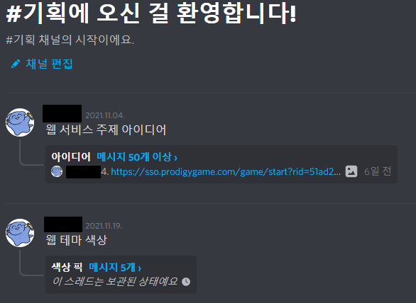1주차에는 거의 대부분의 시간 동안 주제 탐색과 회의를 했습니다. 다들 디스코드를 잘 활용하시더라구요? 디스코드에 아이디어 히스토리 기록을 위한 채팅 채널을 만들고, 그 안에서 스레드를 이용해 관리하였습니다!