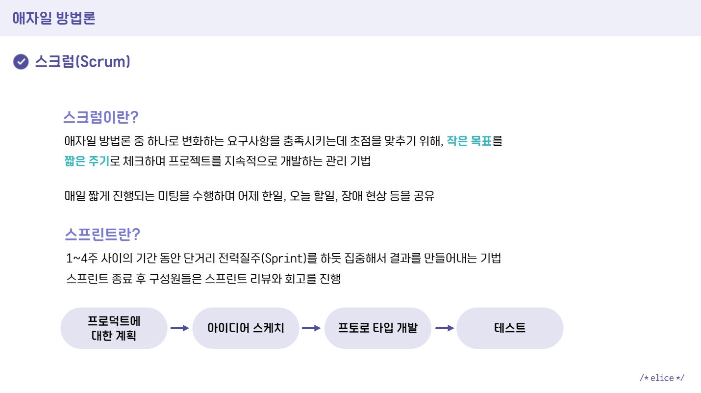 스크럼은 매일 하는 짧은 미팅인데요, 앨리스에서 제공해준 슬라이드의 내용처럼 어제 한 일, 오늘 할 일, 장애 현상 등을 공유합니다. 인턴 할 때는 간략하게 채팅으로 어제 한 일, 오늘 할 일 등만 공유하기도 했습니다.
