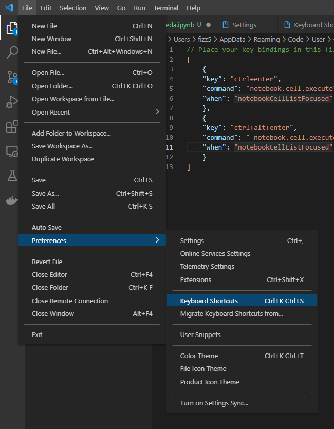 1. 좌측 상단 File -> Preferences -> Keyboard Shortcuts로 이동